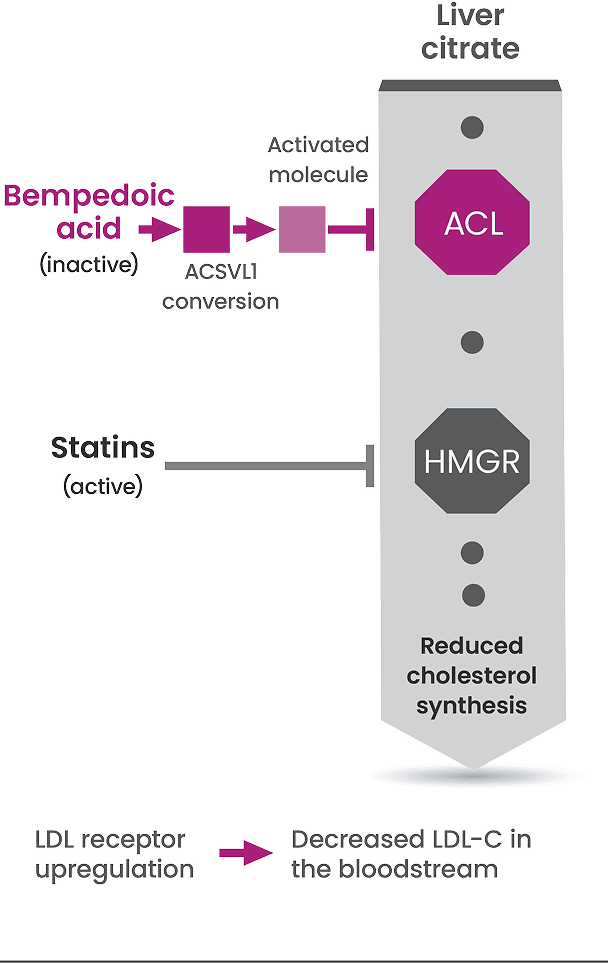 - Bempedoic acid is activated by a naturally occurring enzyme, ACSVL1, which is found in the liver—but is undetectable in skeletal muscle